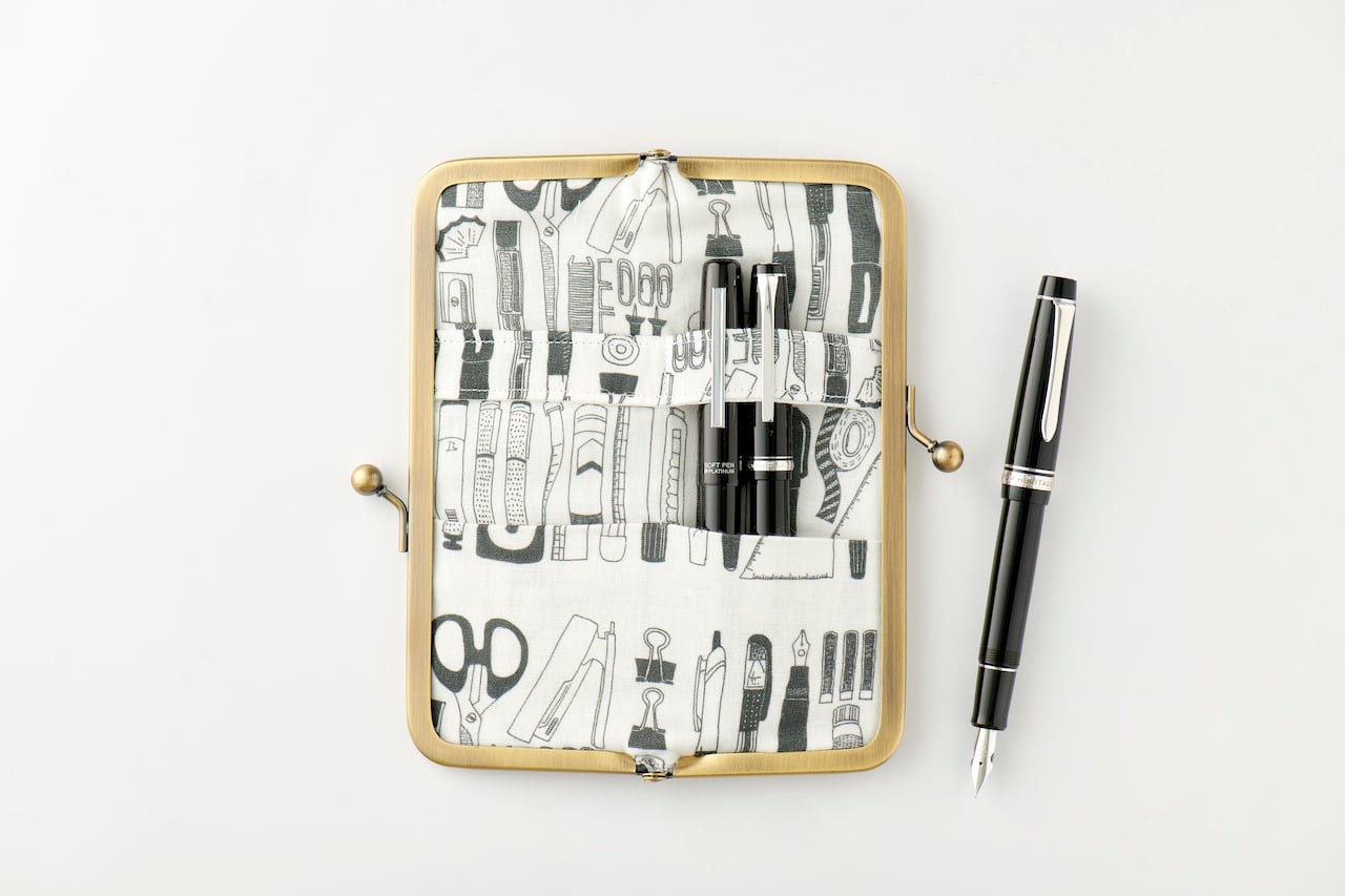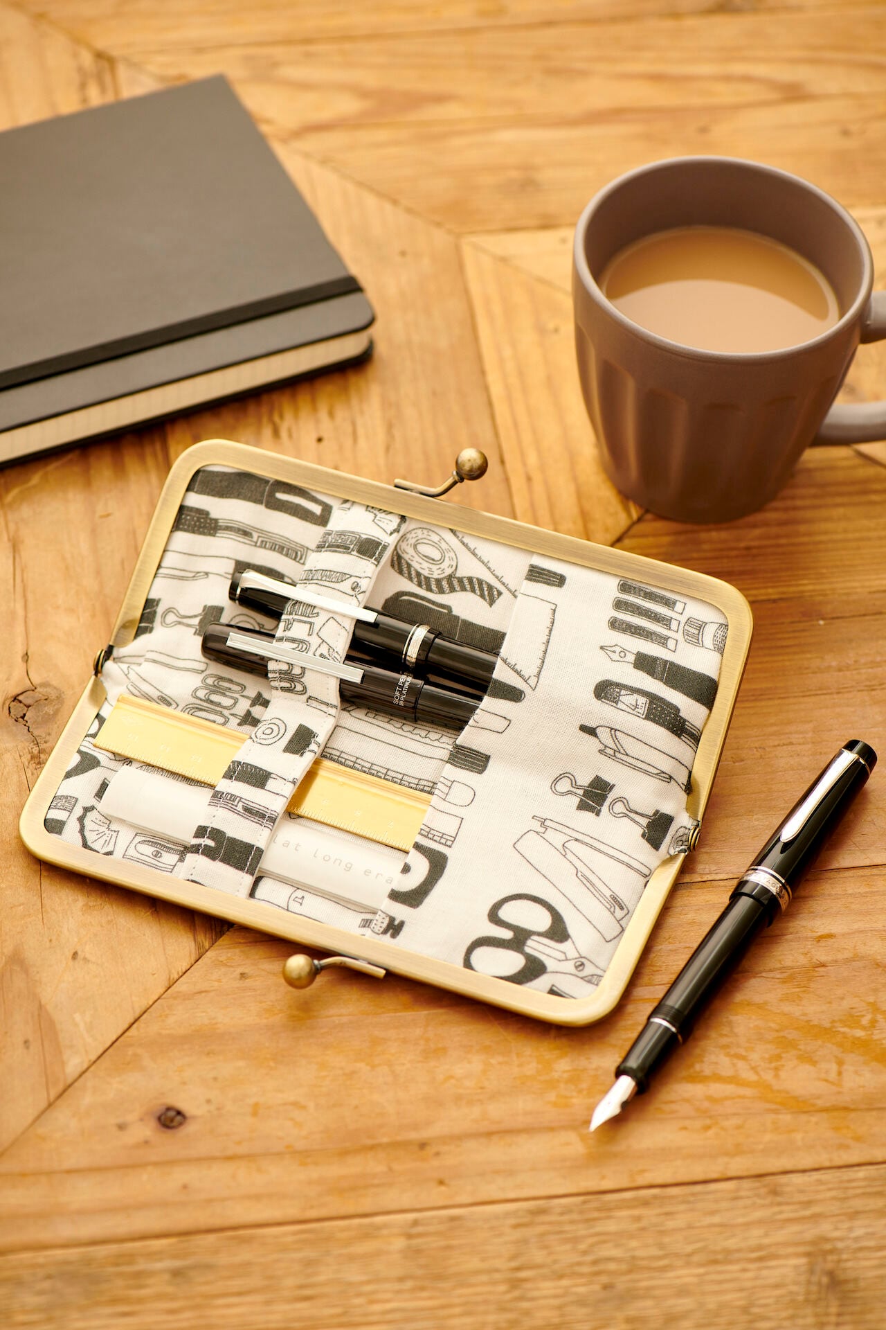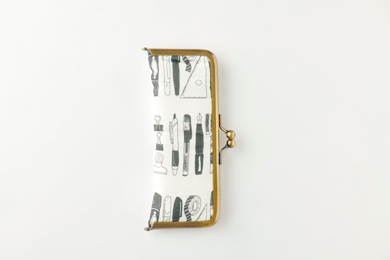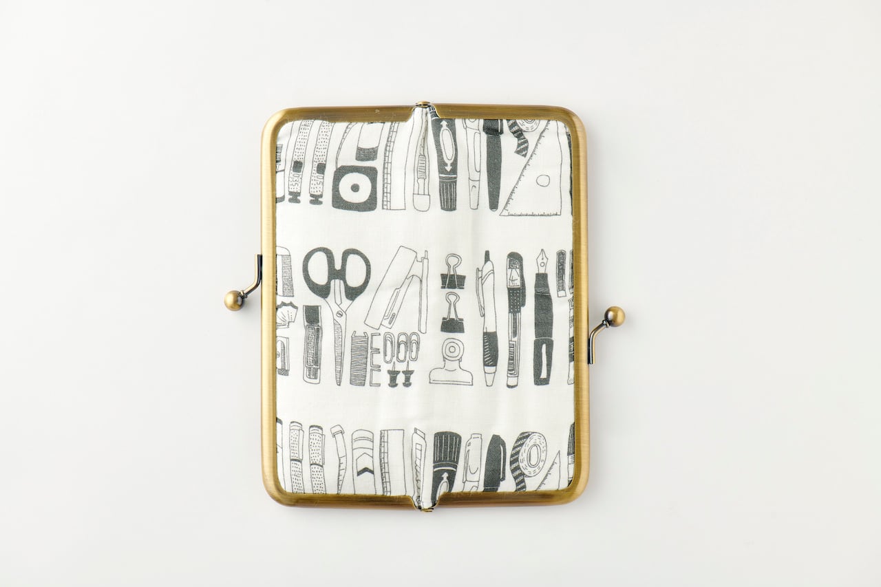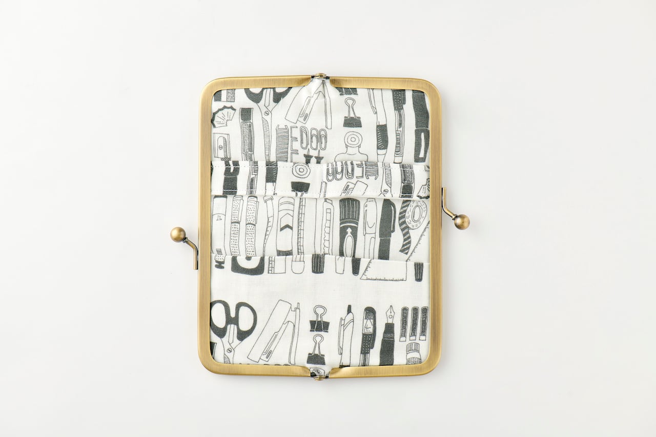 ヨシムラマリさん( @coromegane )の手描きの文房具柄の生地で作りました。見覚えのある文房具がずらっと並んでいます。