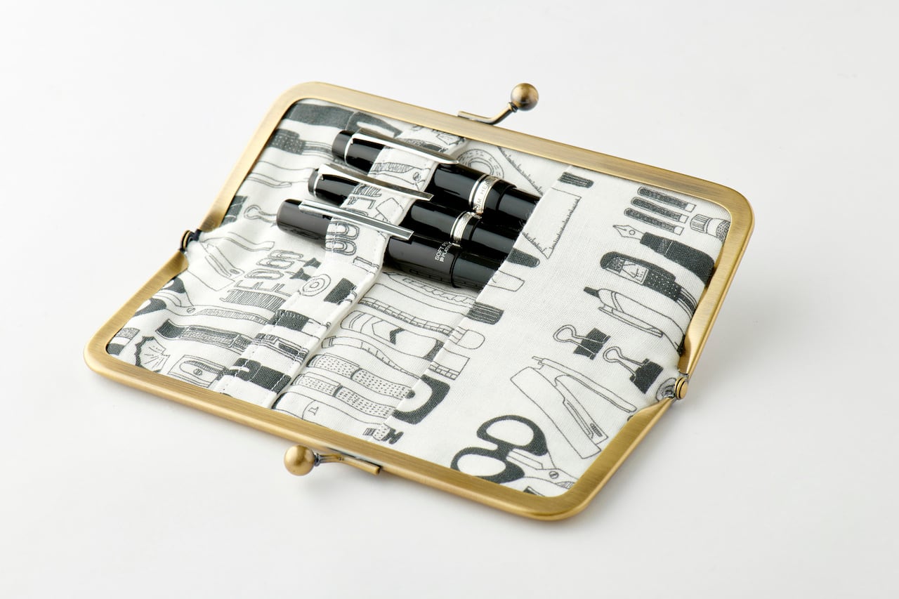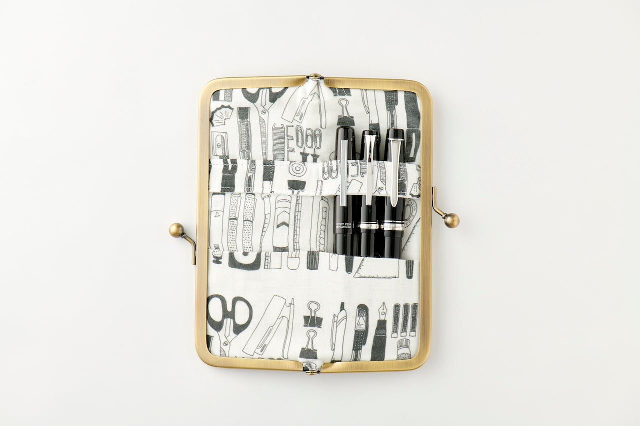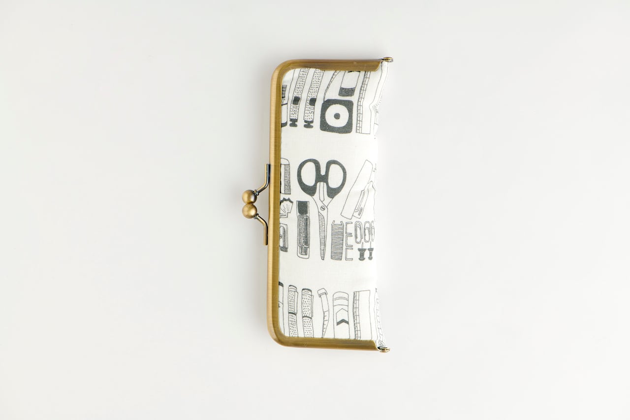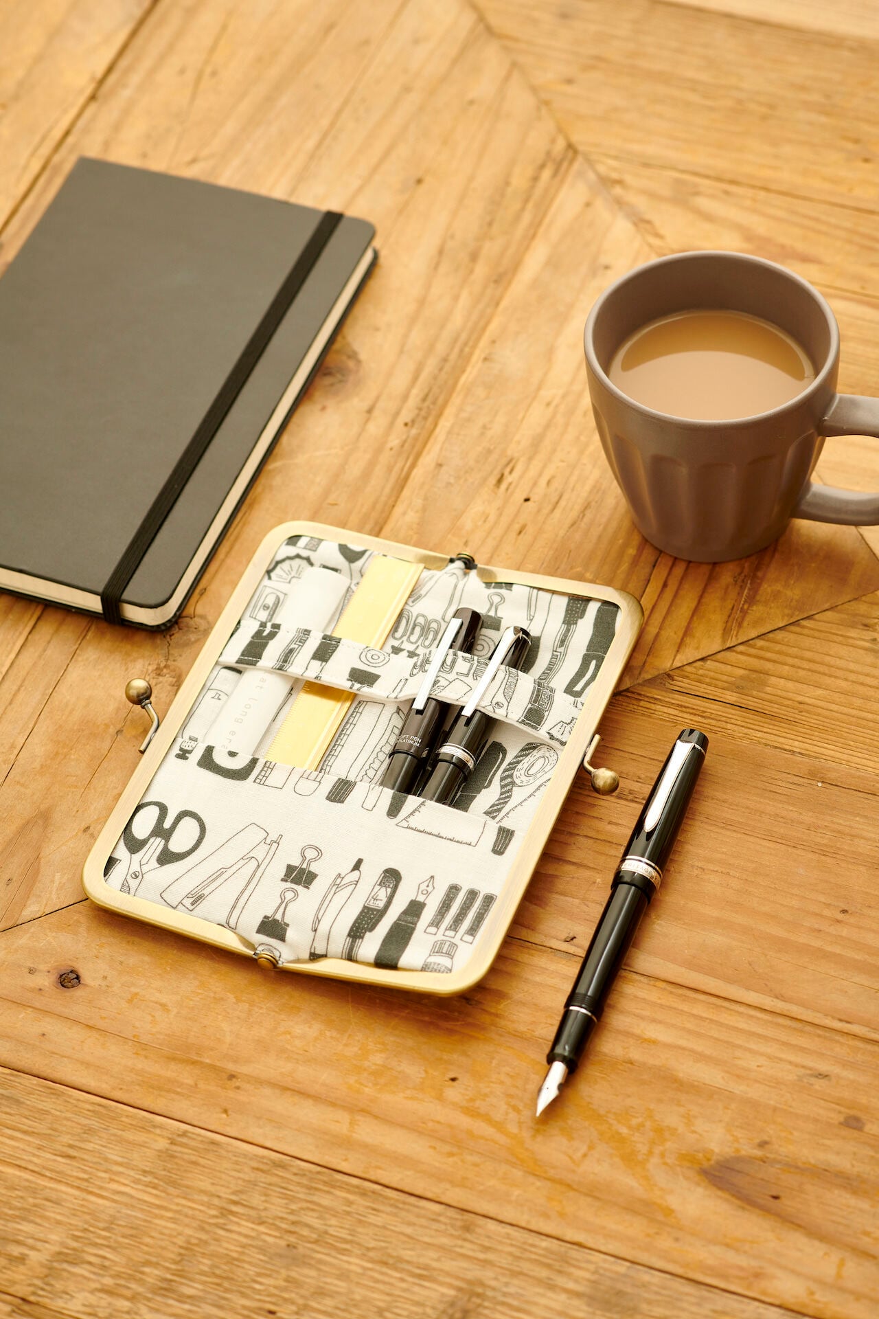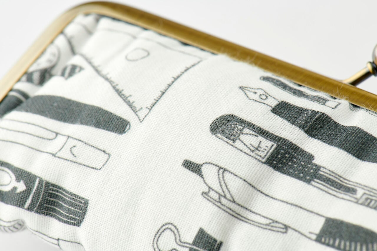 ヨシムラマリさん( @coromegane )の手描きの文房具柄の生地で作りました。見覚えのある文房具がずらっと並んでいます。
