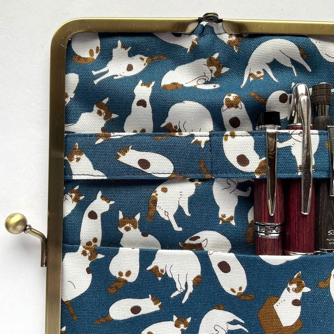 一見シンプルなデニムカラーのペンケースだけれど、開くとネコだらけ!
